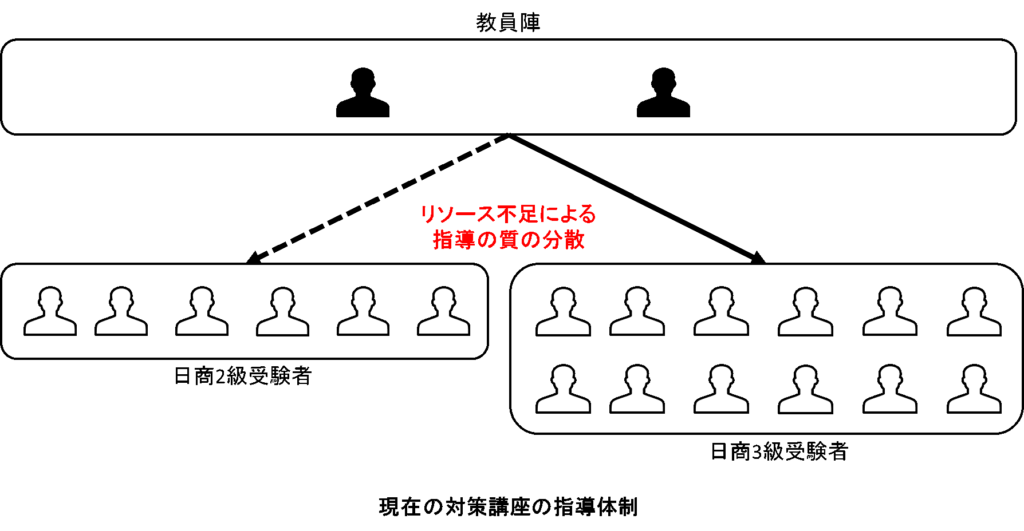 そもそも、指導者側の「リソース不足による個々の学生に対する指導の質が分散する」という問題点が対策講座には内在していると考えています。こうした問題点は、日商簿記検定を受験しようとする学生が増えれば増えるほど、またより上位の簿記・会計系の資格を学生が取得しようとすればするほど、如実に表れてくる可能性を有しています。