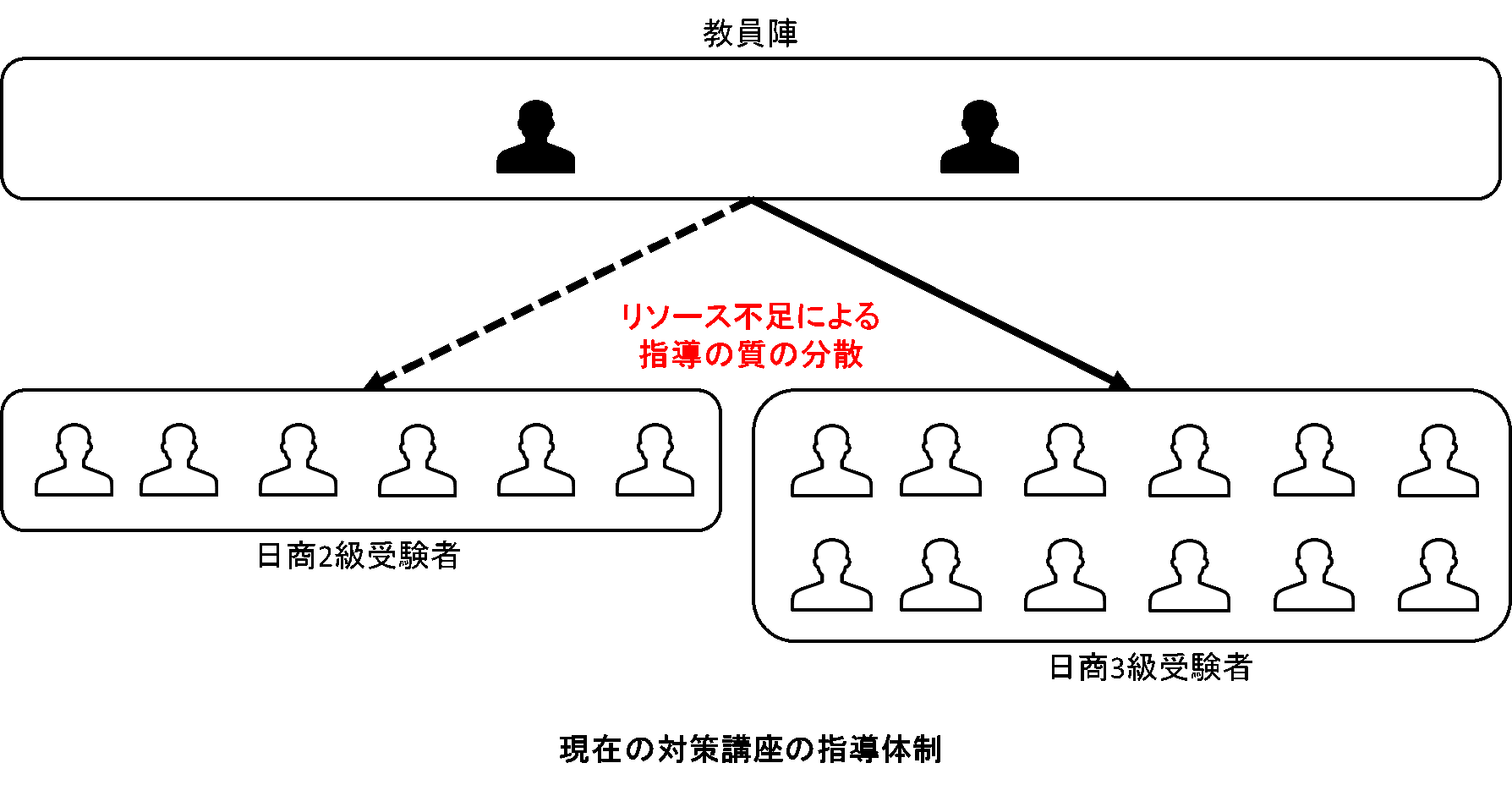 しかしながら、資格取得を一つの目標としている対策講座において、どうしてもつきまとう問題点として挙げられたのはマンパワー不足、言い換えれば教員側の「リソース不足によって個々の学生への指導の質が分散する」が存在するということでした。