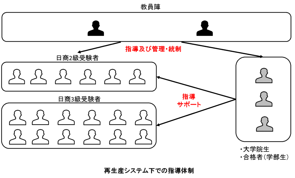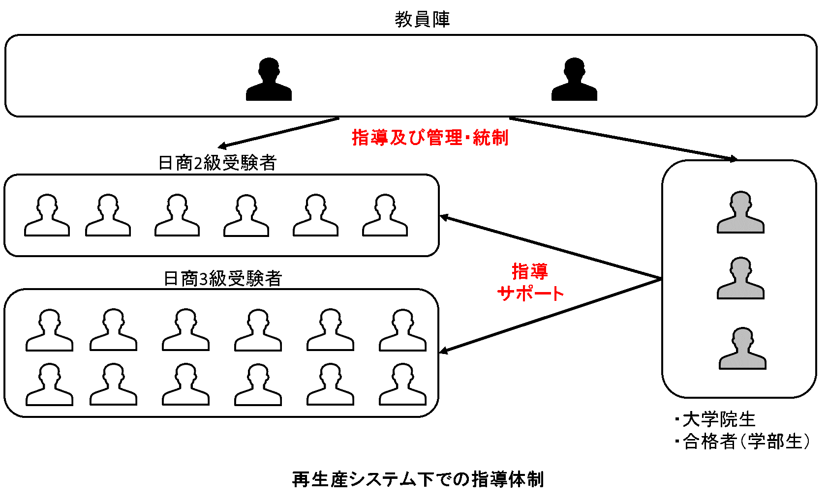 構想する「学生+教員による日商簿記検定合格者の再生産システム」とは、これまで指導者が教員のみであった対策講座の体制に、指導及び受験生にサポート役として税理士受験を目指す大学院生や日商簿記検定合格者を加え、教員側は指導と対策講座の管理を行うというものです。(ティーチングアシスタントやスチューデントアシスタントの利活用が理想的)