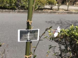 「桜50本植樹工事一式 福山大学同窓会連合会 令和2年2月18日」というプレートが、すべての苗木に付けられています。
