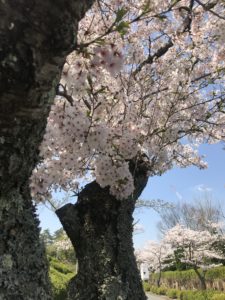 爛漫たる陽光の下、今年も桜の花が綺麗に咲いています。桜の木の幹は、ずいぶん樹齢を重ねたことをうかがわせます。