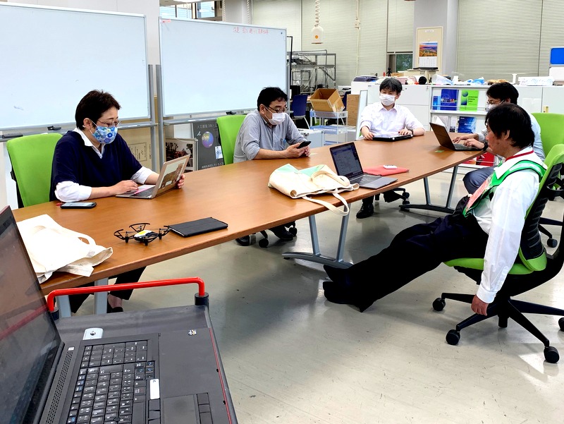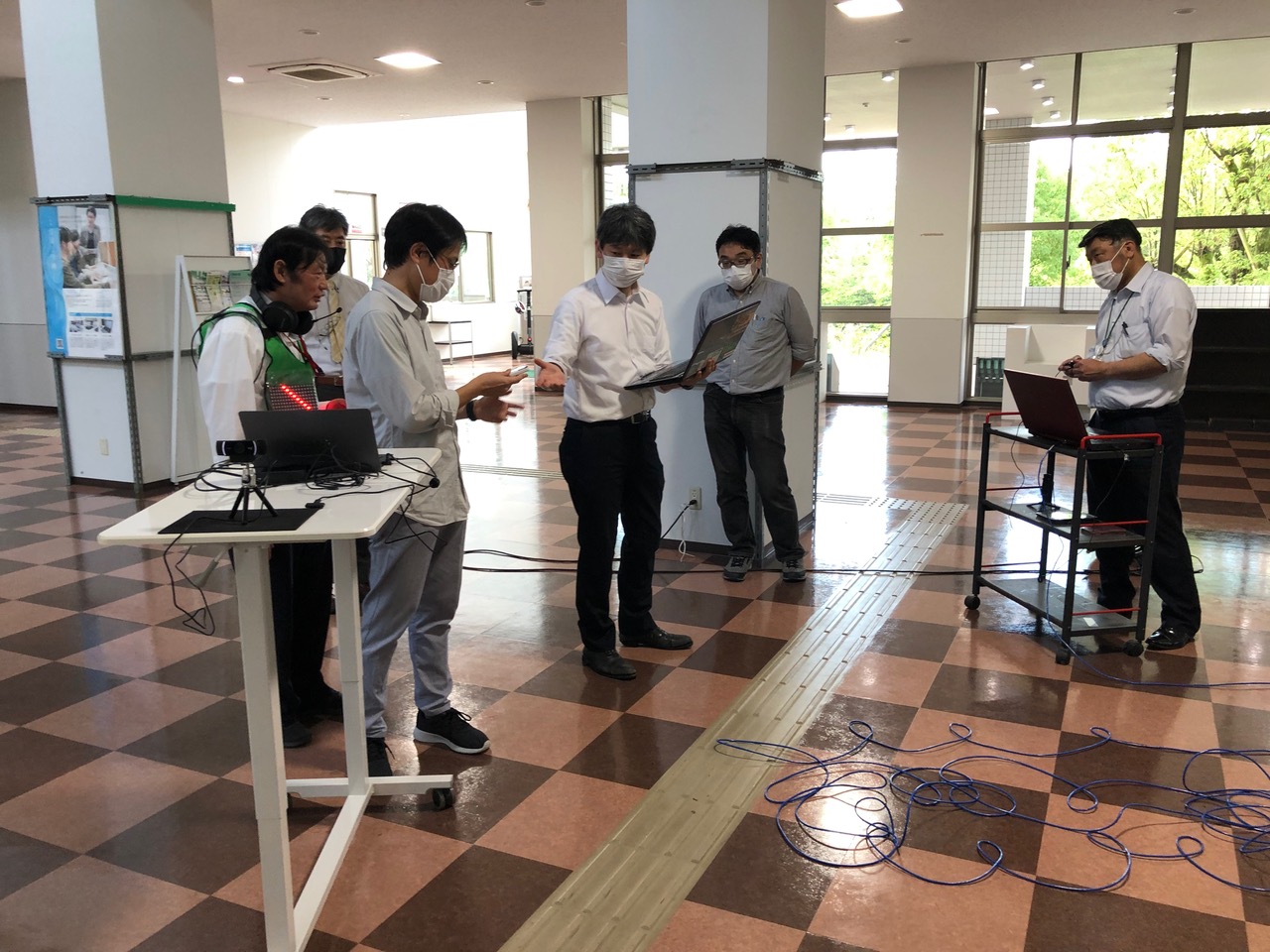 上の写真のように、工学部のエントランスホールからスタートです。各学科でPCを持ち寄って配信の状態を確かめています。ドローンの飛行実験や上空からの撮影の様子なども確認し、興味深い映像が撮れました。