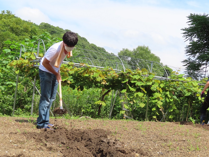 やっとこさ始まった実習。新型コロナウイルスの影響で気をつけなければならないことがたくさんありますが、特に暑い中、マスクをつけながらの農作業でしたので、つらくなったら端の方でマスクを外して休むなどしながら行いました。実は午前11時頃、大雨が降って17号館3階から実習担当である秦野教授の「なんでや~~~~」という泣き声に近い叫び声が聞こえてきましたが、午後には晴れて良かったですね。まずは、鍬(くわ)で畝(うね)を作りました。