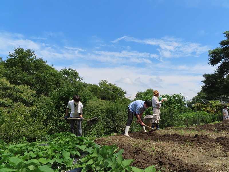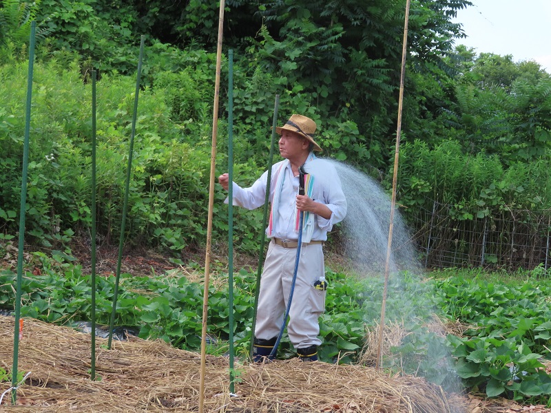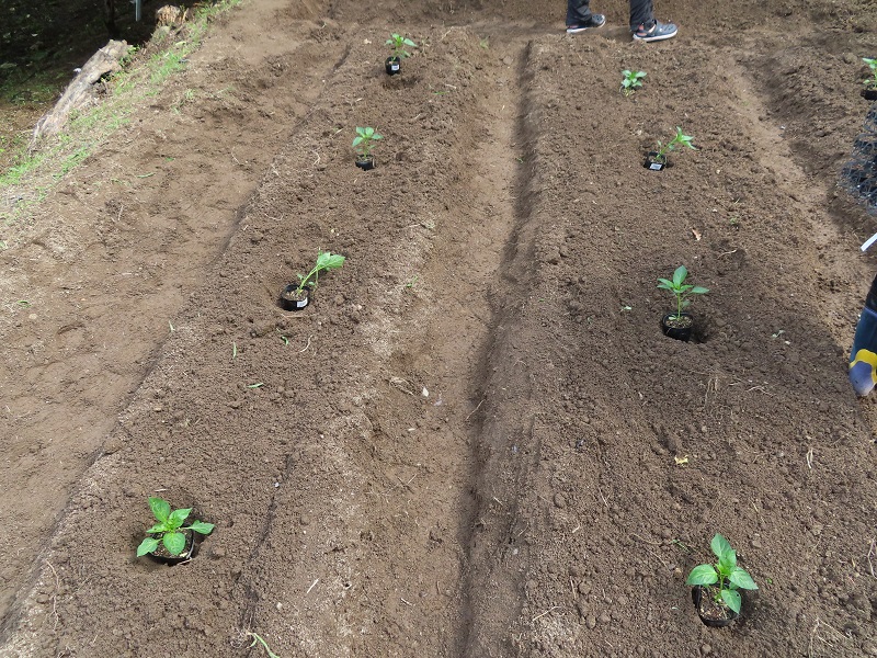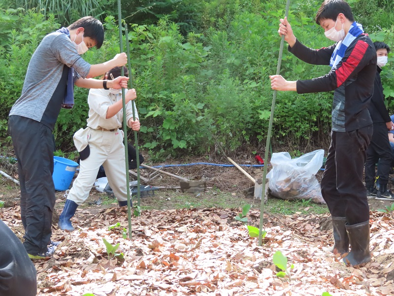 苗を植えたらポールを立てて、苗をやさしくひもで括り付けます。苗以外の場所には雑草が生えないよう、落ち葉や藁(わら)を敷き詰めました。ちなみに、農業高校出身の心強い学生もおり、きれいな畑ができました。今後は、それぞれの班で水やりをしながら成長を観察していきます。