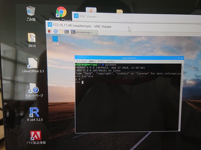ディスプレイやキーボードが必要になりますが、これを人数分確保するのは大変です。そこで、学生にはそれぞれのBYODパソコンを持参してもらい、そのパソコンと各学生に割り当てられたRaspberry Piについて、VNC Viewer というソフトウェアを使って接続してもらい、各自のBYODパソコンからRaspberry Pi を使ってもらいました。このことは、共有のキーボードやマウスを通じたウィルスの感染を防ぐことにも役立っていると思います。