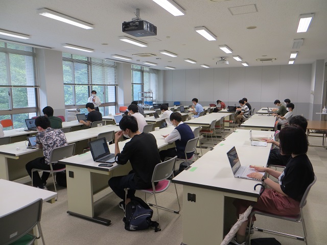 なお、まだ大学に来るのが困難な学生もいるので、オンライン授業のときと同様に、Zoom を使ってこの授業に参加することも可能にしました。ちょうど、BYOD室にはZoomを使うためのネットワークが整備されていたので幸運でした。
