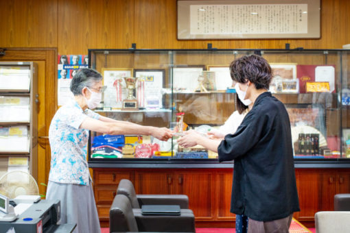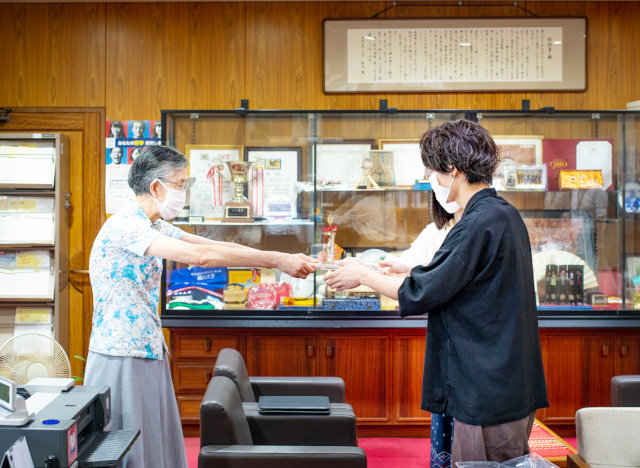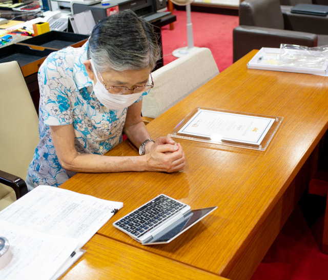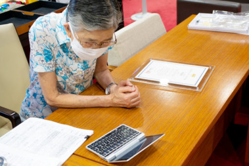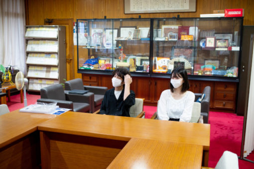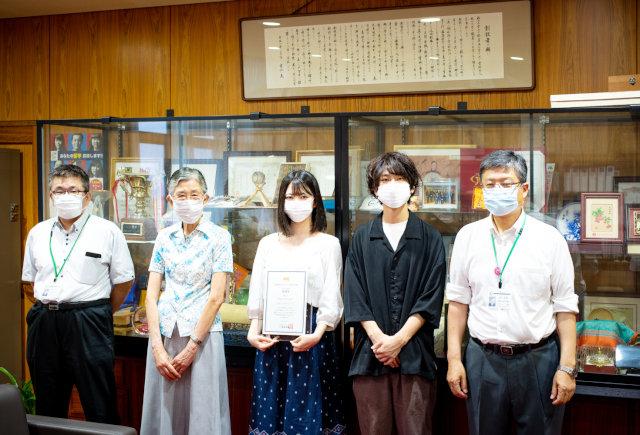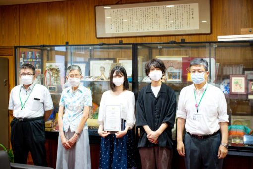 そして、7月6日(月)に受賞について、松田学長に報告しました。受賞の連絡は3月下旬に届いていたのですが、新型コロナウイルス感染症拡大の影響でこの時期となってしまいました。また、密を避けるために、受賞者6名の中から代表者2名のみ、さらにマスクを着用しての訪問となりました。
