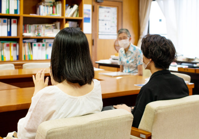 学長室でやや緊張気味の学生たち。左から岡本くん、船越さん