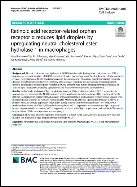 2020年4月に科学誌 BMC Mol. Cell Biol. へ掲載された松岡浩史講師德永吏紀さん(学部生)、片山未由さん(学部生)、細田雄一郎さん(学部生)、宮薫子さん(学部生)角拳斗さん(学部生)、大石亜美さん(学部生)、上敷領淳准教授志摩亜季保さん(博士課程大学院生)道原明宏教授の共著論文『Retinoic acid receptor-related orphan receptor α reduces lipid droplets by upregulating neutral cholesterol ester hydrolase 1 in macrophages レチノイン酸関連オーファン受容体αはマクロファージにおける中性コレステロールエステル水解酵素の上方制御により脂肪滴を縮小させる)』 の研究成果が、報道関係各社に取り上げられました。【プレスリリース