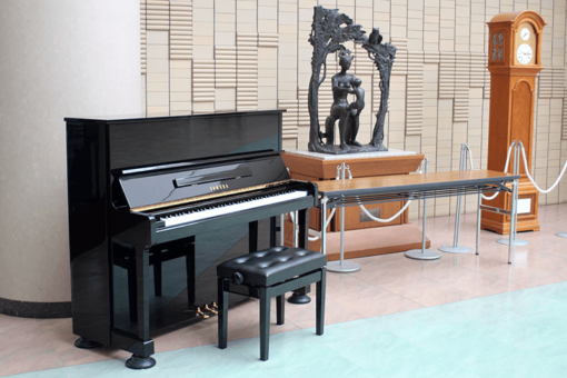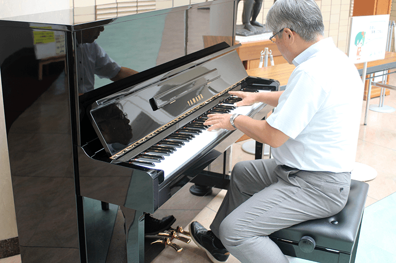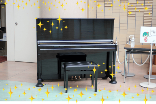 大学会館のエントランスホールにピカピカのピアノがやってきました。学生の皆さんが学びを究めるだけでなく、キャンパスライフも楽しんでもらいたいと願う学校法人福山大学の 鈴木理事長 の思いで、いつでも誰でも自由に楽しめるストリートピアノが実現しました。広いエントランスは天井も高く、心地よいピアノの音色はどこまでも広がります。