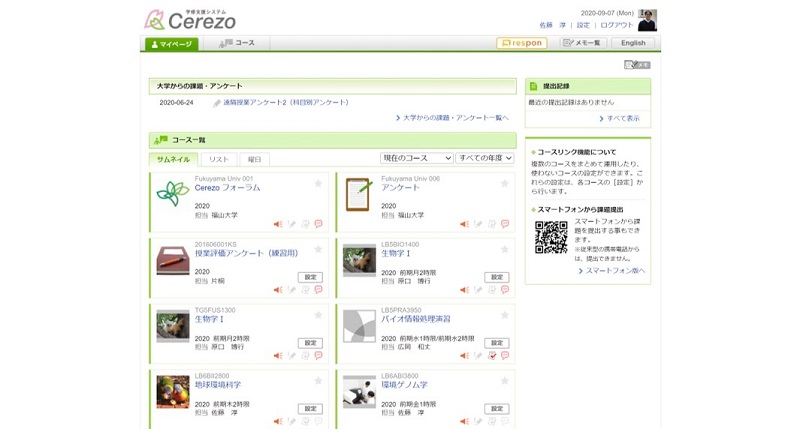 福山大学では、全学的に学生と教員の間で双方向のコミュニケーションを行う学修支援システムを使っています。一般的には「manaba」(商品名)と呼ばれていますが、本学では「cerezo(セレッソ)」(本学キャンパスを彩る桜にちなんで)と呼んでいます。cerezoは、コロナ禍以前から講義の補助材料として活用してきました。