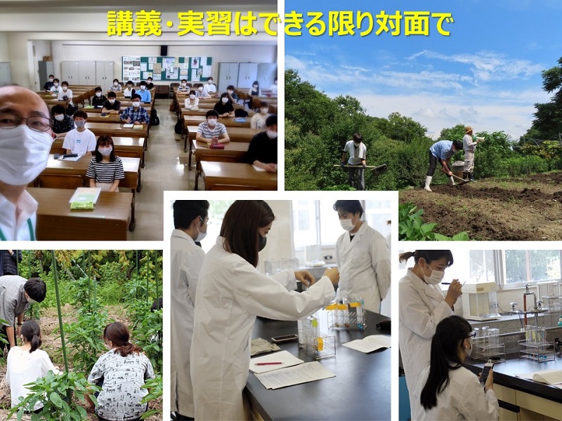 このように、できることはオンライン講義で行ってまいりましたが、私たちはバイオテクノロジーの学科ですので、手を動かして学ぶことがとても大切な学問です。実験やフィールドでの作業が、それに相当します。手を動かす作業は、さすがにオンラインではできません。前期には、一度に大学に来る学生の数をコントロールしながら細心の注意を払い、対面で実験や調査を行いました。The only source of knowledge is experienceです。