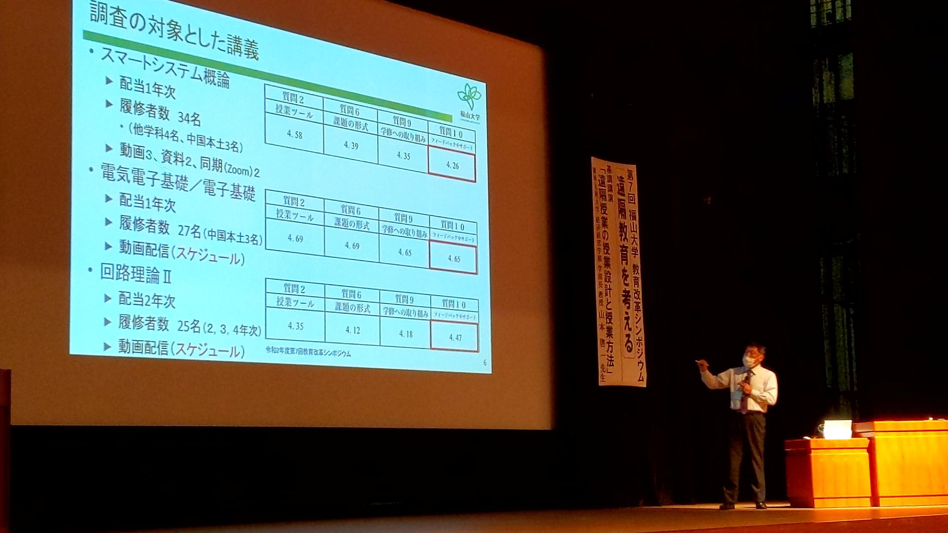 学長から一言:私も最後までしっかり参加しました。。。最初の佐藤教授の授業評価アンケートの結果は、もちろん中には評点の低い方もありましたが、大旨対面授業と遜色なく安心しました。。。三名の教員の授業実践の報告は、ICT機器の特性・特徴を三人三様に生かした素晴らしい授業実践で、参加者全員の参考になったと思います。。。後期も学生のより良い学びに向けて、コロナに負けず、がんばりましょう!!!