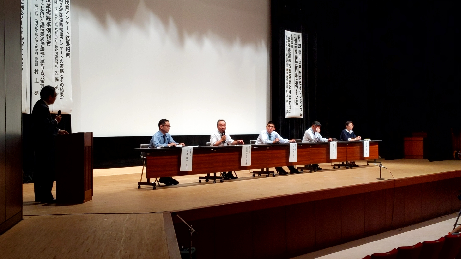 最後に、限られた時間でしたが、発表者全員がステージに上がり、フロアからの質問を受けながら全体討議を行いました。2時間半が短く感じられたほど、充実した内容で今回の教育改革シンポジウムを無事終了することができました。コロナ禍がもたらし、期せずして起こった大学教育方法の大変化はすでに「ポイント・オブ・ノーリターン」を越えたようです。後期の授業開始まであとわずかですが、今回の研修内容や見聞が今後の我々一人一人の授業改善に役立つことを願わずにはいられません。