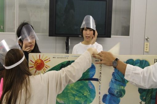 次に、つくしからお借りした『はらぺこ あおむし』の大型絵本の読み聞かせを行いました。これは、木村日菜子さんと山田絵里奈さんが担当しました。絵本の途中で、あおむしが食べた食べ物をクイズ形式で子どもに聞いたり子どもたちが最近食べたものを聞いたりして、双方向のやり取りをしながら進めていきました。ここでは、人形劇のキャラクターも大活躍しました。