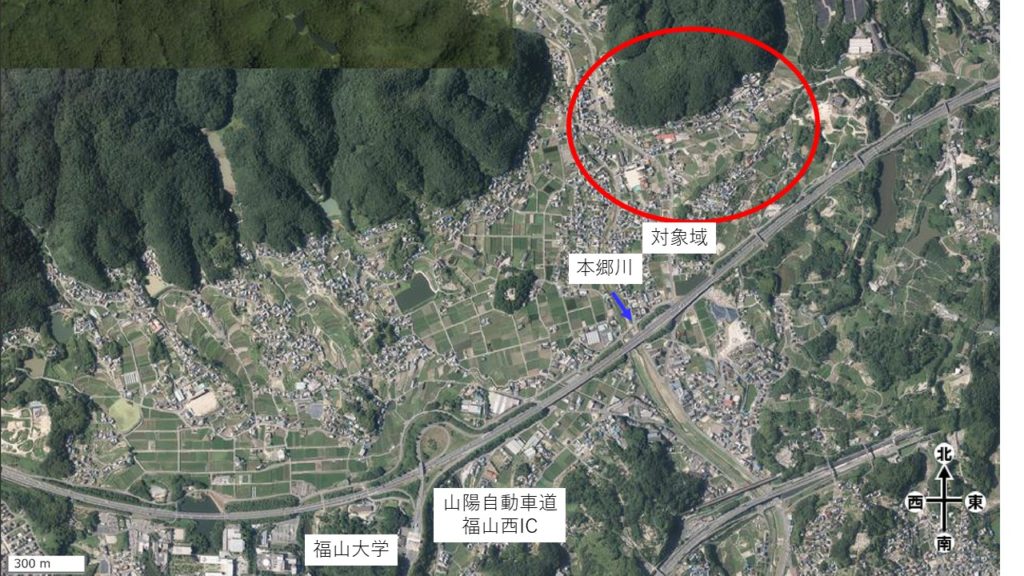 今年度の実践地域防災学は、9月14日(月)から9月18日(金)に開講しました。なお、今回の調査対象域は、下の写真の赤い丸の地域です。