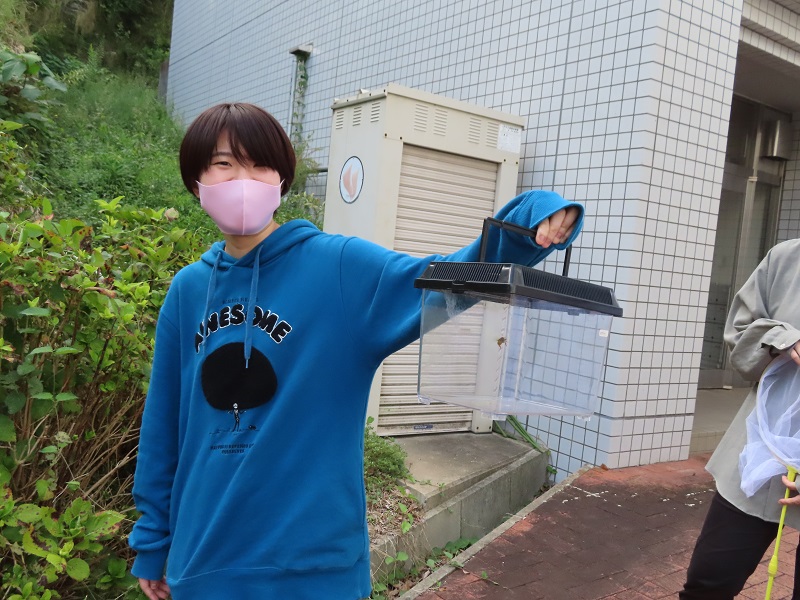 フィールド調査といっても遠出はしません。何故なら、福山大学のキャンパスは森に囲まれており、自然に溢れているからです。生物多様性を学ぶ上ではとっても良い環境です。今年もネズミのワナと虫網をもって動物の捕獲を試みました。学生たちは、思い思いにネズミのワナを仕掛け(ネズミの捕獲には許可を取っています)、好きな虫を採ってきました。虫が平気な人の率が高し。さすが生物工学科の学生たち。採ってきた虫は図鑑で同定をしました。