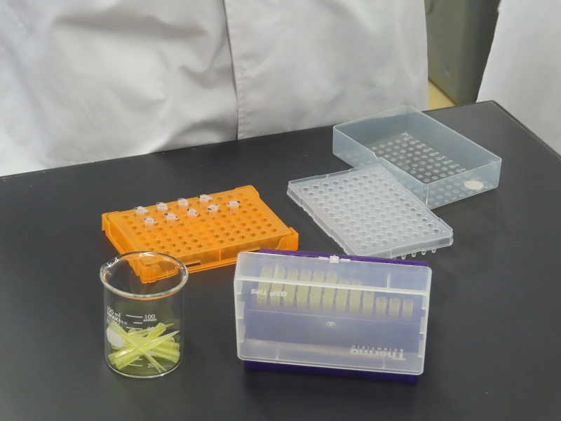 下の写真は、0.2ミリリットルのチューブの底についたDNAを取らないようにゆーっくりと液体を取り除いているところです。DNAは肉眼では見えないので、慎重に作業を行わなければなりません。この作業が終わったら、DNAシークエンサーで塩基配列を解読します!