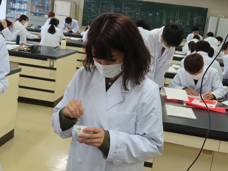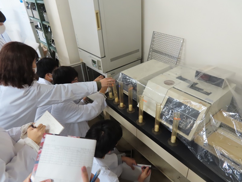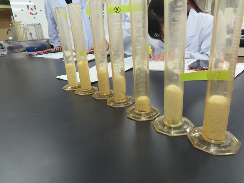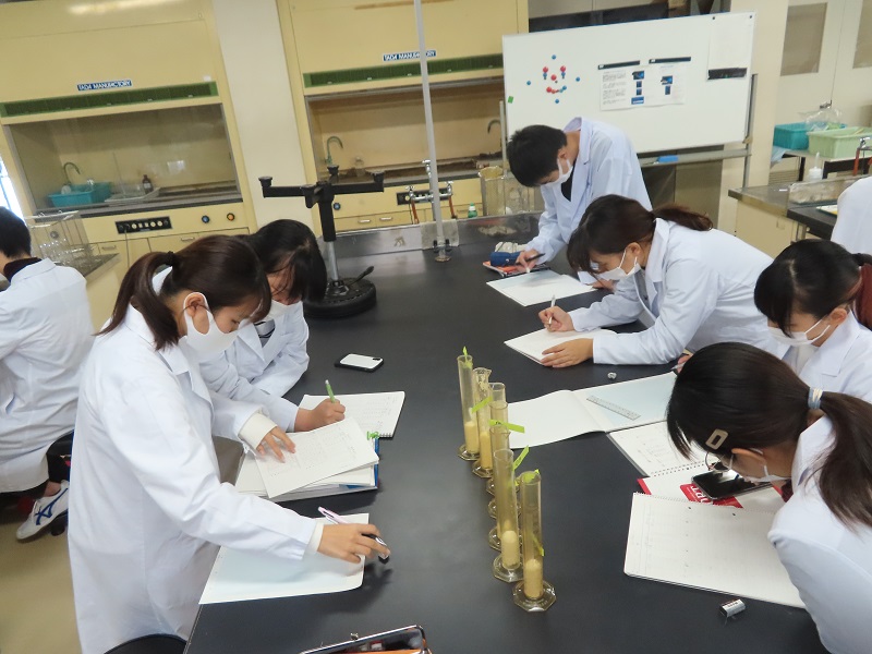 メスシリンダーに様々な条件でこねたパン種を入れて、37℃でインキュベートします。しばらく時間が経つと、条件に応じてパン種の膨らみ具合が変わってきます。それを班のみんなで測定し、どうしてそのような測定値になったのかを条件を見ながら議論します。生物工学科では、このように班のメンバーでコミュニケーションをとりながら実験を行い、そして結果を議論する実習がほとんどです。こうした環境でコミュニケーション能力もつけていただきたいと思っています。