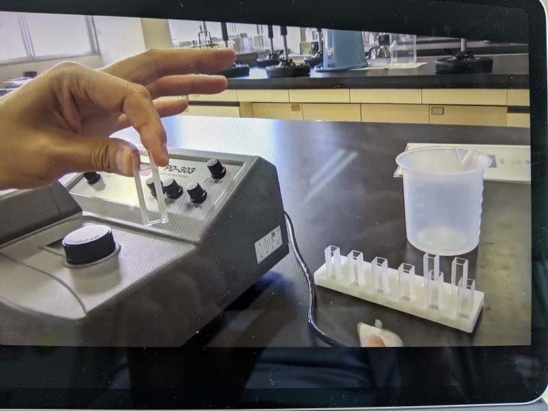 分光光度計の使い方も動画で説明をしました(岩本教授)。ビタミンB2(リン酸リボフラビンナトリウム)がどのような光を吸収するのかを測定し、どのくらいの量があるのかを測定しました。これも、バイオテクノロジーの世界では基礎的な実験になります。