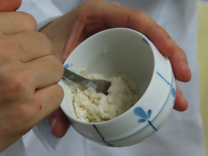 さて、今度は松崎教授と久冨教授による簡単な発酵の実験です。小麦粉と砂糖と塩に水を入れて混ぜて、発酵により生じた二酸化炭素により、パン種が膨らむ程度を測定しました。砂糖や塩の量を変えたり、砂糖の代わりにブドウ糖を加えたりと様々な条件で実験を行いました。内容は簡単ですが、これらの実験を通して様々な器具や機器に触れてもらい、日常的に使えるようになってほしいと思っています。