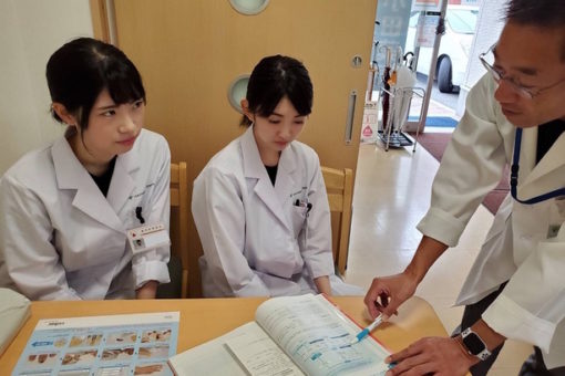 福山大学薬学部では、5年生になると「ふるさと実習」があります。学生は、それぞれの出身地(ふるさと)で薬局や病院の臨床実地実務実習を5か月間行います。指導薬剤師や医療関係者の先生方には、大変お世話になっております。上のキャッチ写真は、山口県の薬局で「ふるさと実習」中の様子です。薬局の一室で、指導薬剤師の先生に実習生2人がご指導をいただいております。