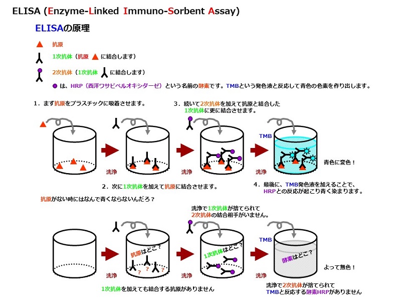 実習で学んだ原理は、以下の図のようなものです。酵素は2次抗体に結合しており、もし抗原が存在したら、それに1次抗体が結合し、さらにそれに2次抗体が結合することで、2次抗体に付いた酵素が無色の物質を青色の物質に変換します。一方で、抗原が不在であれば、酵素を持つ2次抗体が最終的に存在することができないので無色のままとなるといった原理です。