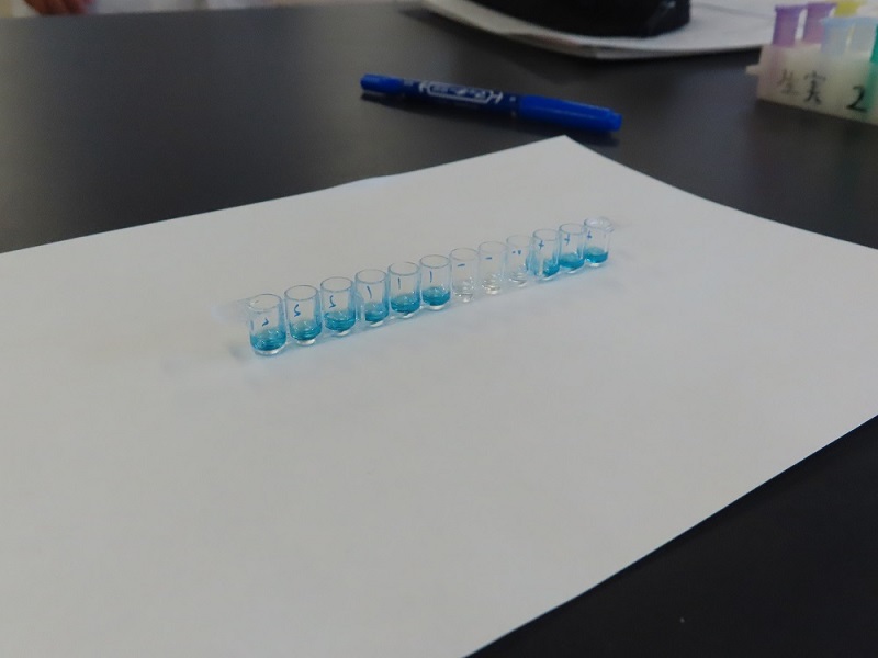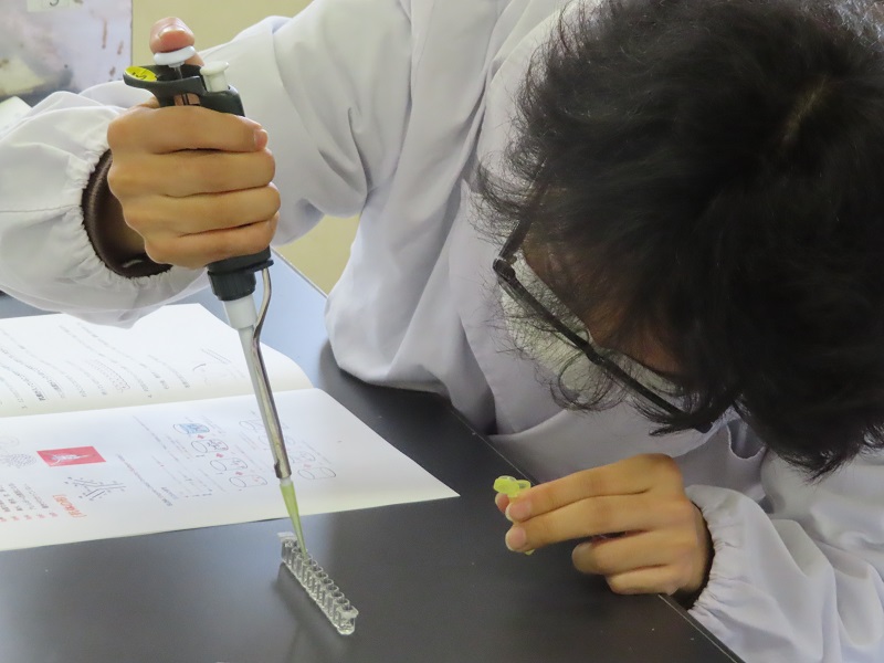 2年生は、マイクロリットルレベルの液体の吸引・排出にはまだあまり慣れていませんので、この実習を通して正しい量の試薬を、正しい場所に、正しい順番で加える練習をします。最初は力が入ってしまいますよね。ここは、実験台に肘を付けて腕を固定するのがポイントです。