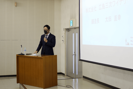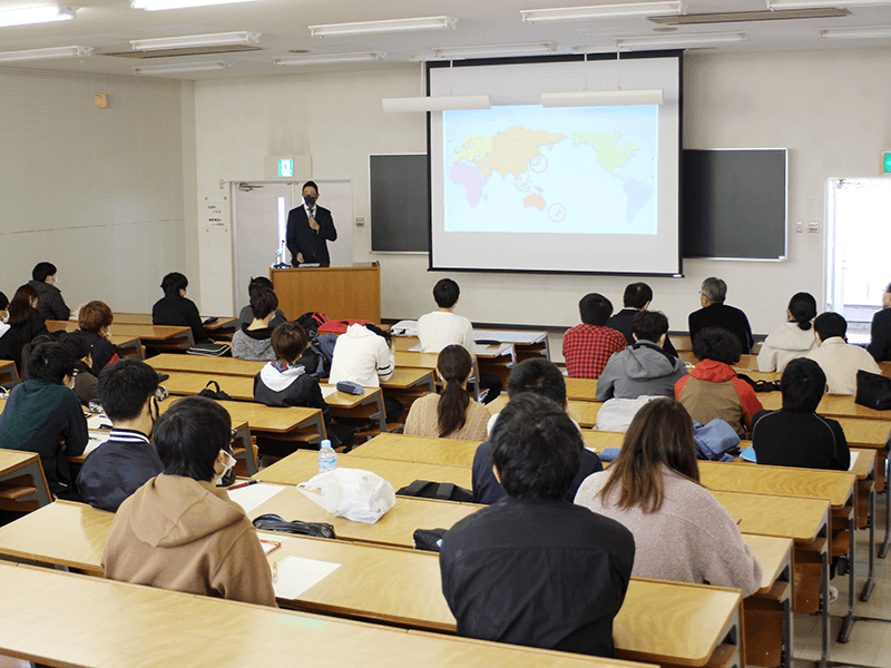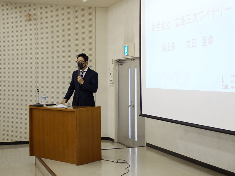 「お酒の講座」は広島国税局の企画で、昨年に引き続き行われました。酒税は国の根幹を支える貴重な財源でもあるため、酒文化の継承のために若い人にお酒に親しみを持ってもらうことが目的です。生物工学科では、ワイン醸造を教育・研究の柱の1つにしていることもあり、今回は広島三次ワイナリーの新進気鋭の醸造家である太田直幸醸造長にお話をいただきました。