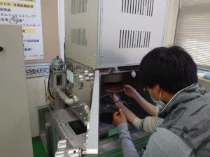 試験片をセットして実験準備です。様々なパーツがあるので壊さないようにセットしますが、まだ慣れないので慎重にセットします。