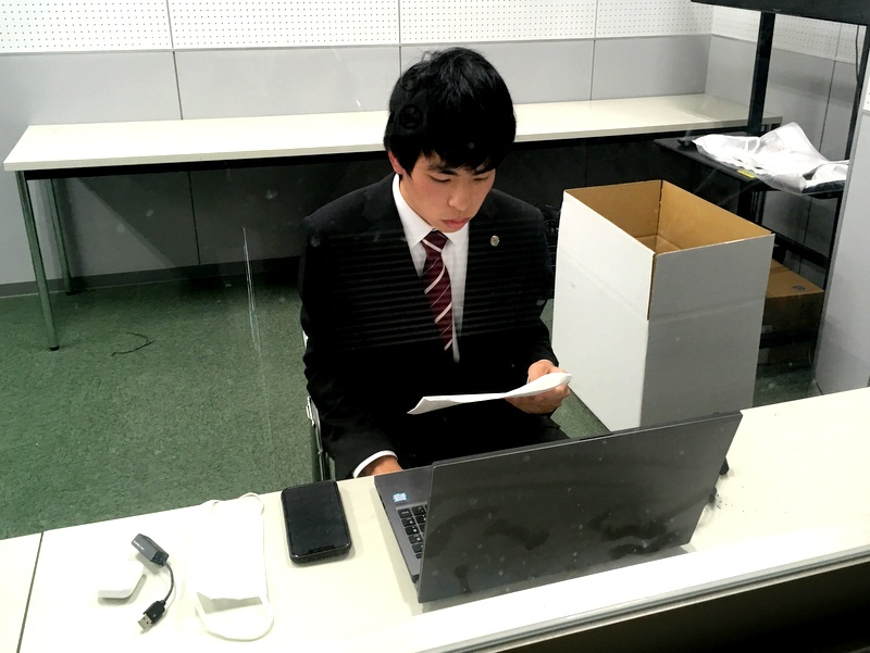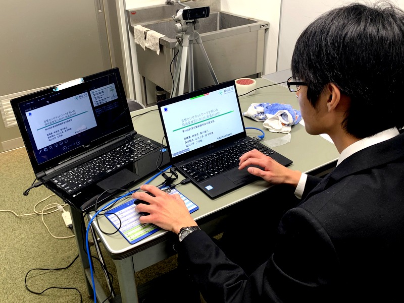 まず先日、昭特科学振興財団の研究助成を獲得した2年生の行平さんは、その研究の一環でドローンを用いた災害情報収集システムに関する研究発表を行いました。今回の実験では、ドローンに搭載した魚眼カメラと通常のカメラからの動画を比較、またドローンに搭載するロボットの製作に関する報告を行いました。今回の学会は遠隔開催ということで、工学部棟3階の小グループ室を使い、以下のような形式で発表しました。さらに、ZOOMを使って会場と接続し、ネットで参加した方々と質疑応答を行いました。会場からは「災害対応は非常に重要な研究」というコメントをいただきました。