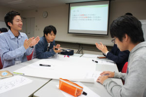 プレゼンテーションでは「福山のおしいところをどのように解決するか?」をテーマに、各グループで一つ問題を取り上げ「なぜなぜ方式」を使って解決策を考えました。「なぜなぜ方式」とは一つの問いに対して深く掘り下げて原因を見つけ解決策を考える方法です。発表では、寸劇をするなど各グループ工夫を凝らしていました。