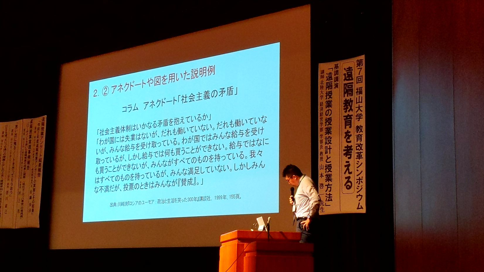 学長から一言:村上准教授の授業を聴いたことはないですが、教育改革シンポでの発表はちゃんと聴きましたよッ!ICT機器の活用テクニックはごく普通でしたが、遠隔授業の中でも、学生の主体的な学びを保証しようという姿勢が印象的で、かつそれはかなり成功しているように見受けられました!