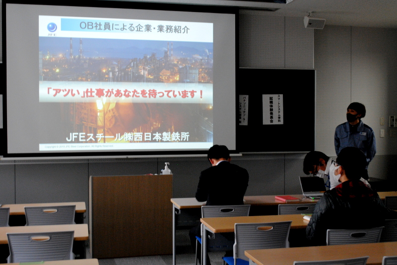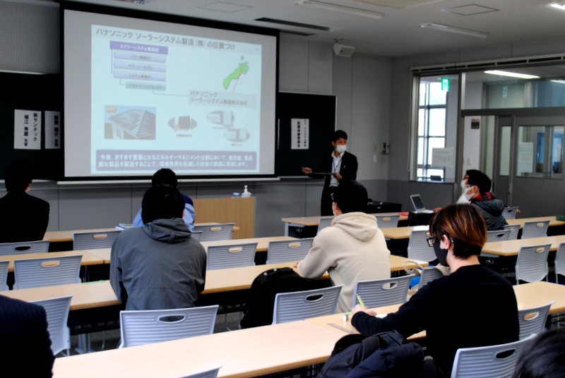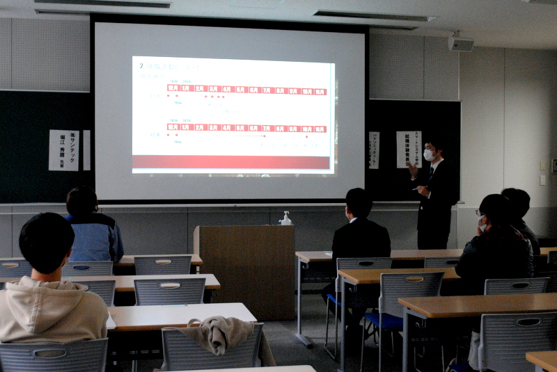 今年は、社会人の講師としてパナソニックソーラーシステム製造株式会社の鐘撞様、JFEスチール株式会社の岩下様をお招きしました。2人は、それぞれスマートシステム学科の前身の電子・電気工学科、電子・ロボット工学科の出身です。また、今年度実際に就職活動を行い、就職が内定している大学院生と4年生も講師として自らの就職活動体験を発表しました。