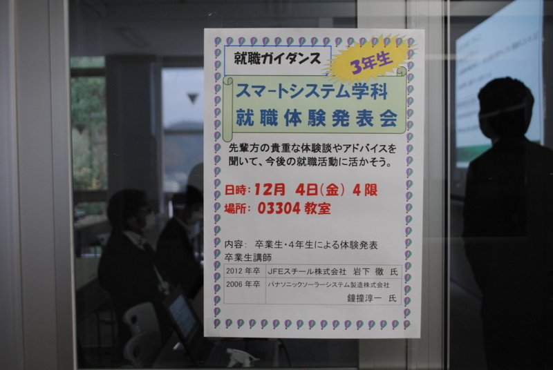 今年の厳しい社会状況の中でも、来春卒業の就職希望学生は全員内定をいただきました! スマートシステム学科は、近年就職率100%を維持しており、学生の就職活動に対するサポートの1つである「就職体験発表会」を、毎年3年生が就活準備をするこの時期に開催し、企業で活躍している学科OBや就職活動を終えた4年生から興味深いアドバイスやコメントを聞いています。12月4日(金)に開催した発表会の模様について、工学部スマートシステム学科(フェイスブックはこちら)の伍賀が報告します。