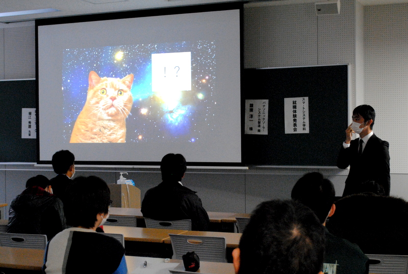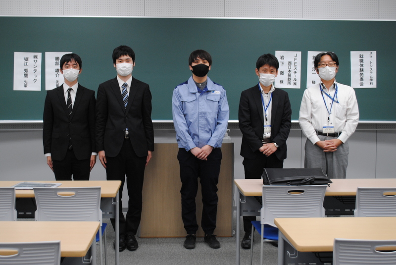 今年度は、社会情勢から非常に厳しい就職活動になることが予想されていましたが、スマートシステム学科4年生の皆さんは、日ごろ培った実力を発揮してくれて、全員就職内定となりました。スマートシステム学科は、その前身の電子・電気工学科、電子・ロボット工学科の時代から就職率はほぼ100%に近い実績を継続しています。今回の就職体験発表では、遠隔就活での実体験の講演もあり、これから就職活動に向かう学生の皆さんに役立つものだったと思います。これから就職活動に向かう学生の皆さんの学生生活が、研究や勉学に就職活動にサークル活動に思い切り打ちこんで充実したものとなるように期待しています。