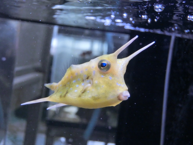 成長すると頭と腹に角のような長い突起が伸びます。英名ではcowfish。