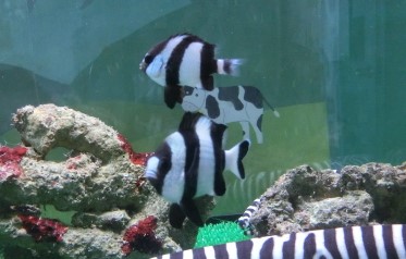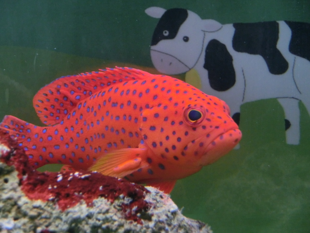 参考までに、ハタの仲間は肉食で小さなスズメダイたちはすぐに食べられてしまいますので、今回の展示は透明のアクリル板で前後を仕切った2重構造です。