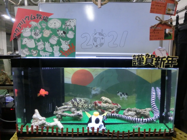 学長から一言:コロナ禍に負けることなく、素晴らしい、そしてなんと多彩な“特別企画展示「丑年」水槽”!!!感動しました!展示を手伝ってくれた二人の4年生、ありがとう!!!水族館に就職できると良いですねッ!