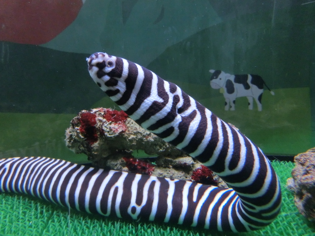 一番目につくのは「ゼブラウツボ」です。その名の通りゼブラ(シマウマ)模様ですが、今回はウシになりきってもらっています。