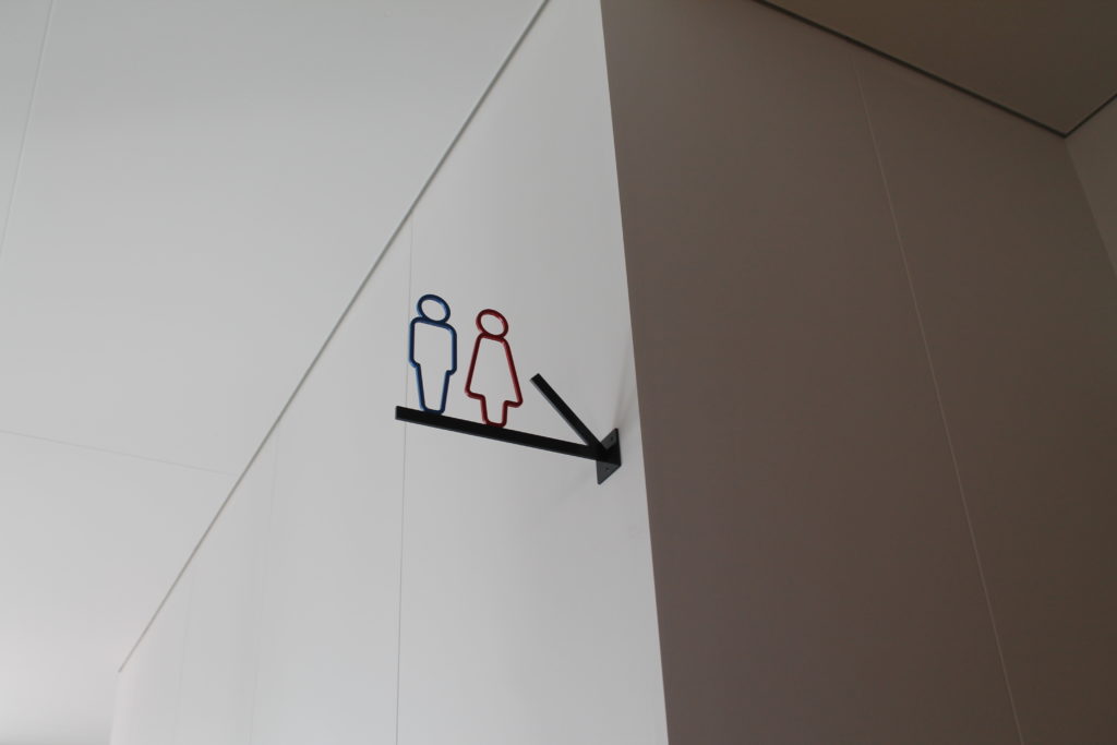 ↑小洒落たトイレの案内表示です。矢印の上にちょこんと並ぶ男女のマークが可愛いですね。