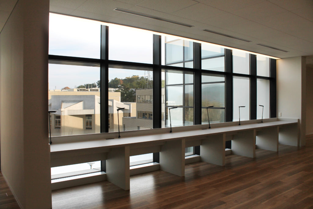 晴れの日には、ここで景色を楽しみながら勉学に励むもよし、雨の日でもデスクライトを完備しており手元が暗くならないので、落ち着いた雰囲気の中で読書を楽しむのもよしですね。