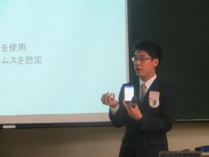 昨年度、「屋内避難時における携帯端末への通知による誘導効果の検証」という題目で、実際に開発した通知システムとその評価結果についてデモを交えて昨年度4年次生の竹本君が発表してくれました。