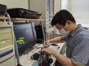 卒業研究を行ったのは、写真右端の伊田君(4年生)です。伊田君は1年生の時から「海中探査プロジェクト」に参加していて、この方面のベテランです。他の2名も「海中探査プロジェクト」のメンバーで、中央が中岡君(2年生)、左端が若木君(3年生)です。なお、若木君は新年度の卒研担当者でもあります。