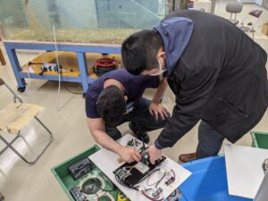 水中ロボットを自力で潜航させるのは思いのほか大変でした。研究の最初の頃は、鉄の重りを付けて無理やり沈めていたのですが、それでは水中での自由な運動ができません。そのため、船体の重心と浮力のバランスを見直したり、推進器をハイパワーのものに取り換えたり、それが原因で電気回路が壊れたりと、悪戦苦闘の連続でした。