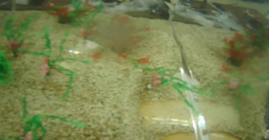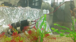 水中ロボットが撮った水底の写真です。ピント合わせが少しうまくいっていませんが、模型の水草がきちんと撮れています。