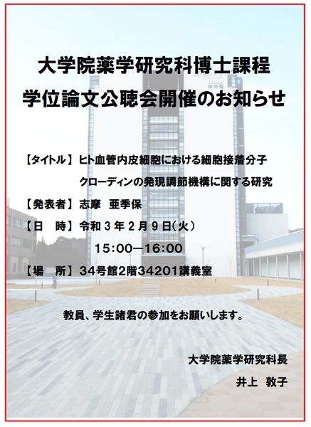 2月9日(火)15時から、薬学研究科の公聴会が開催されました。演者は、大学院薬学研究科博士課程4年生の志摩亜季保氏です。志摩氏は、本学薬学部6年制を卒業後に大学院に進級し、4年間コツコツと「病態生理・ゲノム機能学」を研究してきました。本日は、これまでの研究成果をまとめて学位を申請し、その審査の一環として公聴会を行いました。こんにちは、投稿は薬学研究科の学長室ブロガーAIです。