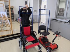 このカメラを取り付けた電動カートなども作りかけていますが、まずは実現可能性の検証のため、下の写真のようなミニチュアの二輪車の製作を先行的に進めました。ハードウェアは完成しましたが、残念ながら時間不足のため、ソフトウェアの方は完成できませんでした。