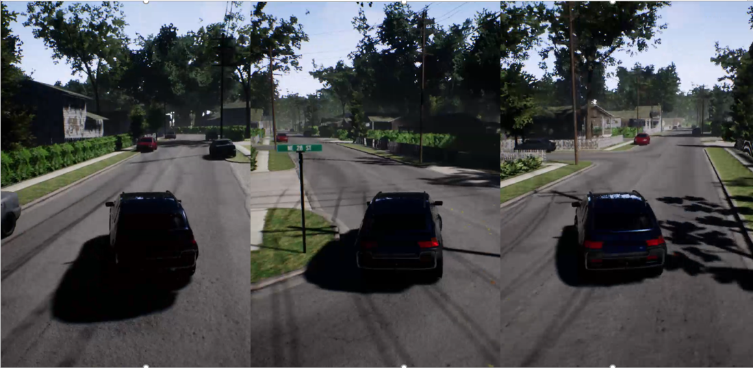 模倣学習は、たくさんの運転データを収集する必要がある点などが地域志向型自動運転に適しません。逆に、強化学習の欠点は実際の道路上で実施できないことです(危険のため)。試しに自動車シミュレータを用いて強化学習を行った後に自動運転のシミュレーションを行ってみると、学習が不足していたらしく、ふらふら蛇行する自動運転になりました(下の写真)。強化学習では、学習に非常に時間がかかることを知らされました。
