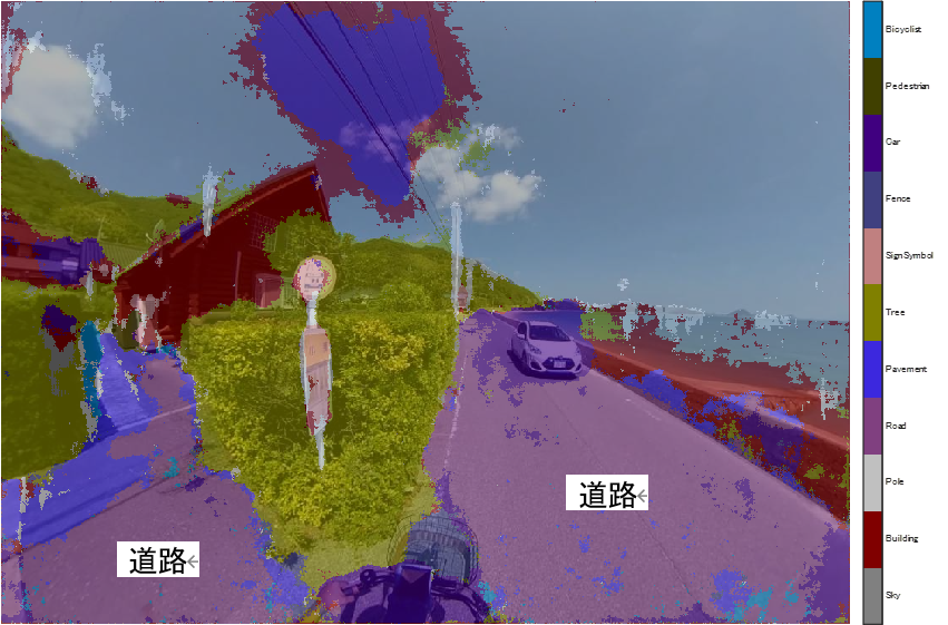 インターネット上で公開されている道路認識用のデータを利用しました。下は、360度カメラで撮影した写真(上段)で道路認識を行った例(下段)です。この例ではうまく道路の部分を認識できましたが、道路上に大きな影が映った写真などの場合はうまくいかないことがわかりました。